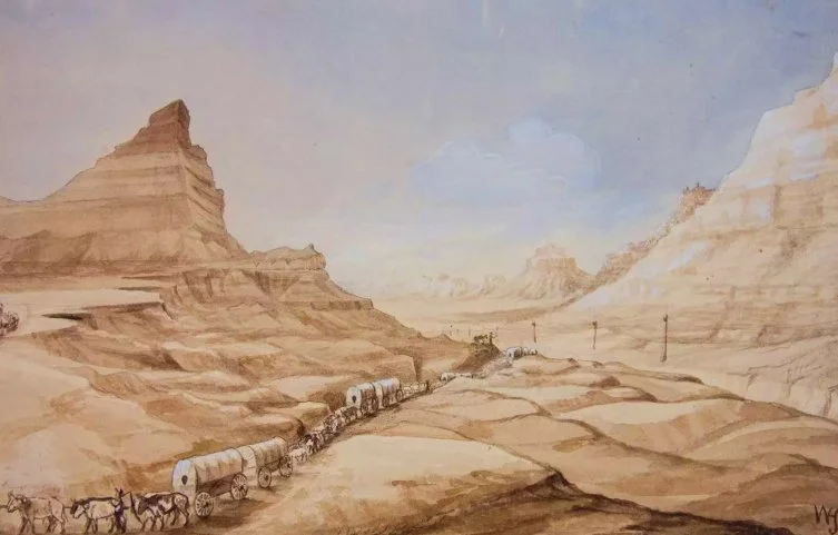 Telegraph lines can be scene in the distance in this 1866 painting of Mitchell Pass in Nebraska by artist William Henry Jackson. (Credit: National Park Service)